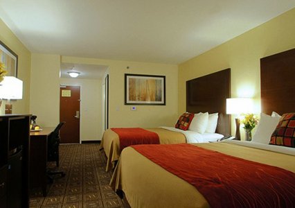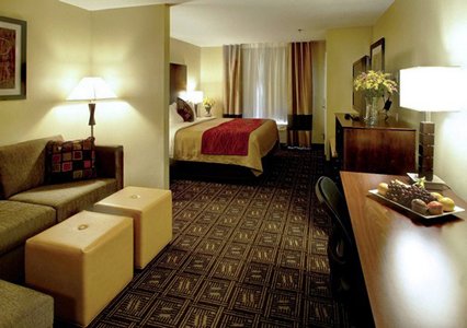 All rooms at this non-smoking hotel offer pillow-top mattresses with crisp white duvets, a flat-screen television, hairdryer, alarm clock, coffee maker, microwave, refrigerator, iron, and ironing board. Suites have a sitting area with a sofa sleeper and some rooms offer a desk.